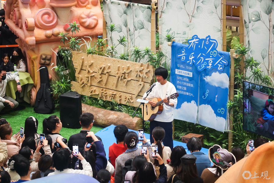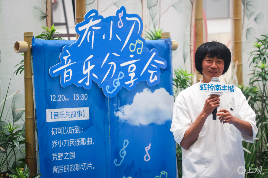 12月20日,艺术家乔小刀举办音乐分享会,带着木吉他弹唱民谣,并与观众面对面交流,讲述木头、铁皮与童话的故事。